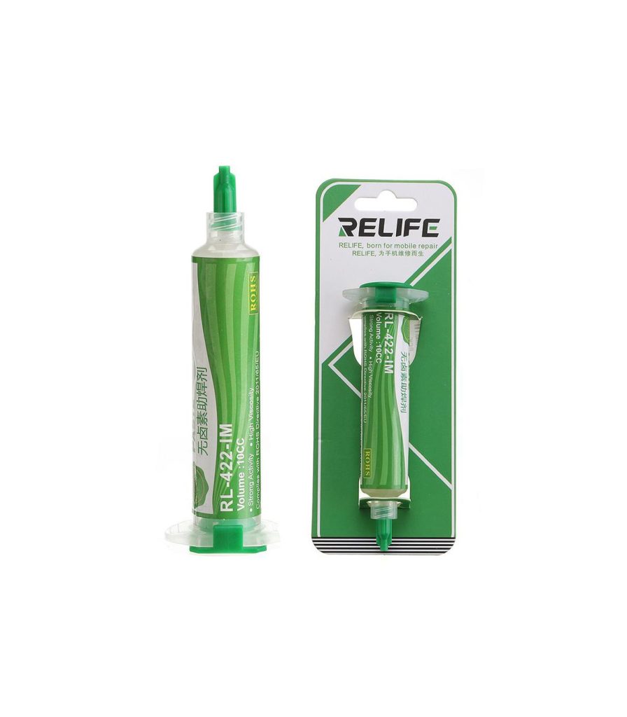خمیر فلکس سرنگی ریلایف RL-422-IM بدون بدون هالوژن و سرب، دارای ویسکوزیته و غلطت بالا و رنگ خمیر (روغن) فلکس کرمی شفاف می باشد.